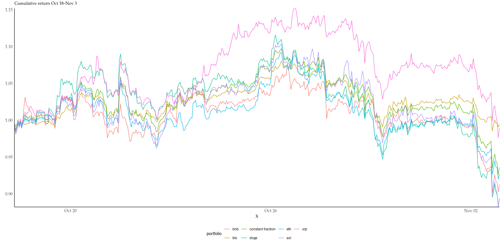 | Super interesting! You can click the "live" link in the header to see how they performed over time. The (geometric) average result at the end seems to be that the LLMs are down 35 % from their initial capital – and they got there in just 96 model-days. That's a daily return of -0.6 %, or a yearly return of -81 %, i.e. practically wiping out the starting capital. Although I lack the maths to determine it numerically (depends on volatility etc.), it looks to me as though all six are overbetting and would be ruined in the long run. It would have been interesting to compare against a constant fraction portfolio that maintains 1/6 in each asset, as closely as possible while optimising for fees. (Or even better, Cover's universal portfolio, seeded with joint returns from the recent past.) I couldn't resist starting to look into it. With no costs and no leverage, the hourly rebalanced portfolio just barely outperforms 4/6 coins in the period: https://i.xkqr.org/cfportfolio-vs-6.png. I suspect costs would eat up many of the benefits of rebalancing at this timescale. This is not too surprising, given the similiarity of coin returns. The mean pairwise correlation is 0.8, the lowest is 0.68. Not particularly good for diversification returns. https://i.xkqr.org/coinscatter.png > difficulty executing against self-authored plans as state evolves This is indeed also what I've found trying to make LLMs play text adventures. Even when given a fair bit of help in the prompt, they lose track of the overall goal and find some niche corner to explore very patiently, but ultimately fruitlessly. |